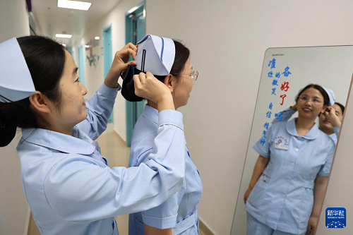 5月12日,山東省濱州市陽信縣中醫(yī)醫(yī)院心內(nèi)科的護(hù)士在互相整理護(hù)士帽。(新華社發(fā) 初寶瑞 攝)