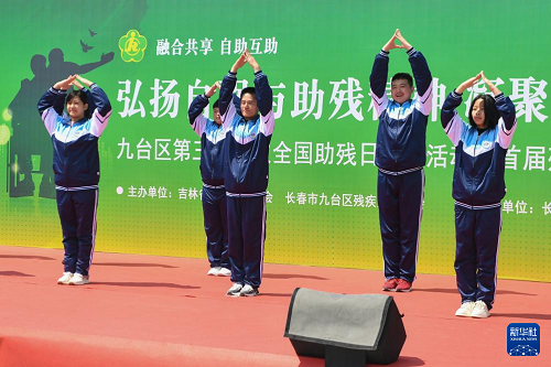 5月15日,在吉林省長(zhǎng)春市九臺(tái)區(qū)善滿家園殘障人綜合服務(wù)中心,九臺(tái)區(qū)特殊教育學(xué)校的殘障學(xué)生表演手語(yǔ)舞蹈。(新華社記者 張楠 攝)