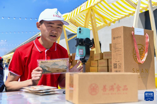 5月15日,在吉林省長(zhǎng)春市九臺(tái)區(qū)善滿家園殘障人綜合服務(wù)中心,殘障員工在網(wǎng)絡(luò)直播間向網(wǎng)友介紹產(chǎn)品。(新華社記者 張楠 攝)