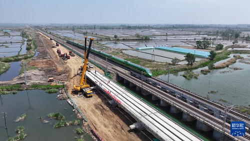 這是5月19日拍攝的沈山鐵路鴨子河中橋新建大橋架梁工程施工現(xiàn)場(無人機照片)。(新華社記者 吳青昊 攝)
