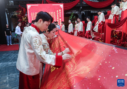 5月20日,參加集體婚禮儀式的新人們簽訂移風(fēng)易俗簡婚承諾。(新華社記者 徐昱 攝)