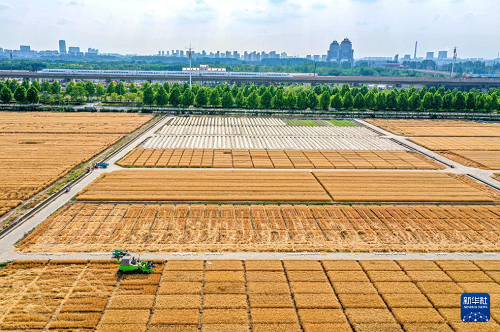 5月20日,在江蘇里下河地區(qū)農(nóng)科所(揚州市農(nóng)科院)試驗田,農(nóng)民駕駛收割機收割小麥(無人機照片)。(新華社發(fā) 任飛 攝)