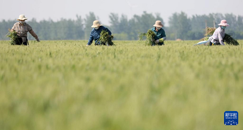 5月20日,河北省滄州市滄縣捷地回族鄉(xiāng)馬辛莊村的農(nóng)民進行麥種提純作業(yè)。(新華社發(fā) 周洋 攝)