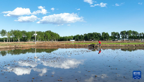 5月22日,農(nóng)民在內(nèi)蒙古興安盟扎賚特旗好力保鎮(zhèn)一處稻田中插秧。(新華社記者 馬金瑞 攝)