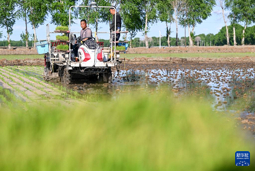 5月22日,在內(nèi)蒙古興安盟扎賚特旗好力保鎮(zhèn)一處稻田中,農(nóng)民使用衛(wèi)星導(dǎo)航、自動(dòng)駕駛的農(nóng)用機(jī)械插秧。(新華社記者 貝赫 攝)