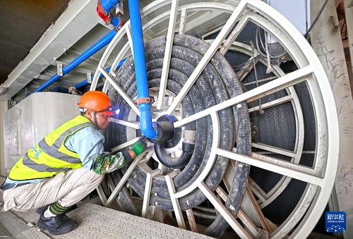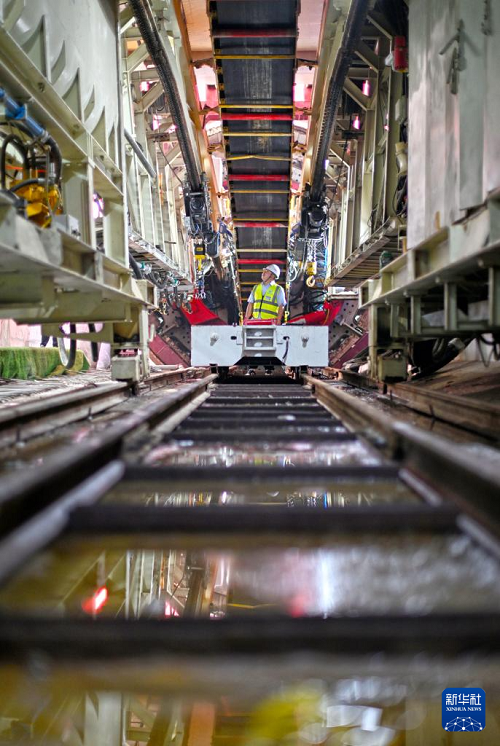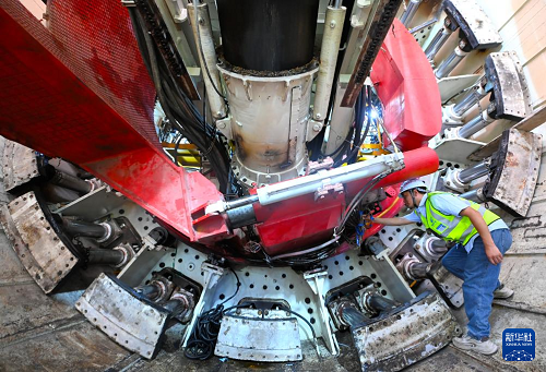 5月26日,施工人員在“青年先鋒號(hào)”盾構(gòu)機(jī)始發(fā)前檢查設(shè)備。(新華社記者 趙子碩 攝)