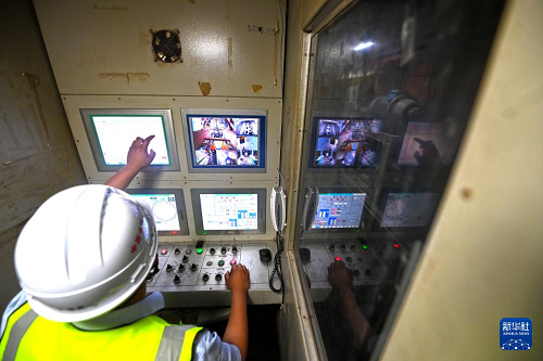 5月26日,施工人員在“青年先鋒號(hào)”盾構(gòu)機(jī)操作室檢查設(shè)備運(yùn)行情況。(新華社記者 趙子碩 攝)