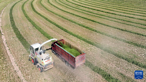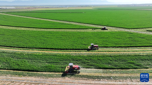 日前,甘肅省張掖市甘州區(qū)畜牧產(chǎn)業(yè)園內(nèi)優(yōu)質(zhì)飼草基地里的苜蓿開始采收,大型飼草收割機(jī)、自走式粉碎機(jī)、運(yùn)輸車等來回穿梭,場面壯觀。