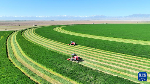 5月27日,大型飼草收割機(jī)在采收成熟的紫花苜蓿(無人機(jī)照片)。(新華社發(fā) 成林 攝)