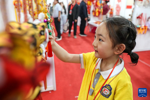5月29日,小朋友在慶陽香包民俗文化節(jié)非遺沉浸體驗區(qū)挑選香包。(新華社記者 郎兵兵 攝)