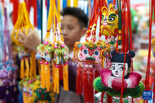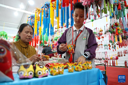 5月29日,在慶陽香包民俗文化節(jié)非遺沉浸體驗區(qū),一名學(xué)生放學(xué)后幫忙整理自家攤位上的香包。(新華社記者 郎兵兵 攝)