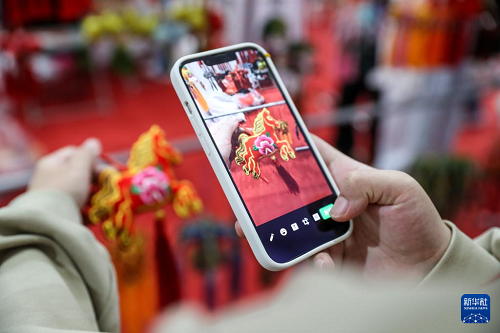 5月29日,市民在慶陽香包民俗文化節(jié)非遺沉浸體驗區(qū)拍攝生肖“馬”香包。(新華社記者 郎兵兵 攝)