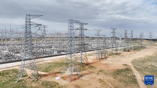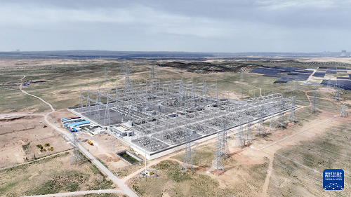 6月8日拍攝的寧國(guó)運(yùn)靈武100萬(wàn)千瓦光伏復(fù)合項(xiàng)目330千伏輸變電工程線路終點(diǎn)——北地750千伏變電站(無(wú)人機(jī)照片)。(新華社記者 王鵬 攝)