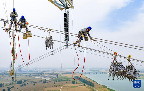 6月11日,在安徽省滁州市鳳陽縣淮河邊,安徽送變電工程有限公司施工人員在百米高空進(jìn)行淮河大跨越作業(yè)(無人機(jī)照片)。(新華社發(fā) 鄭賢列 攝)
