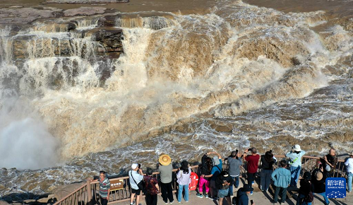 近日,受上游降雨影響,位于山西吉縣和陜西宜川縣交界的黃河壺口瀑布水量大增,壯美奔騰景象吸引眾多游客前來游玩。