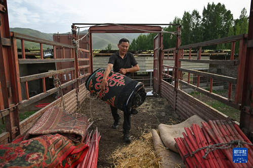 轉場第一天,在新源縣那拉提鎮(zhèn)塔依阿蘇村,巴拉提江在家中小院內把毛毯搬上貨車(6月10日攝)。(新華社記者 胡虎虎 攝)