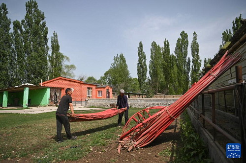 ?轉場第一天,在新源縣那拉提鎮(zhèn)塔依阿蘇村,巴拉提江(左)和鄰居一起抬著氈房結構部件走在家中小院內(6月10日攝)。(新華社記者 胡虎虎 攝)
