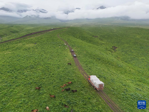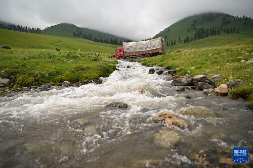 轉場第二天,載著氈房等生活物資的貨車駛過一處涉水路段(6月11日攝)。(新華社記者 胡虎虎 攝)