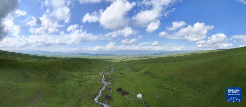 這是6月11日在新疆新源縣那拉提草原拍攝的巴拉提江家的夏牧場和氈房(無人機照片)。(新華社記者 胡虎虎 攝)