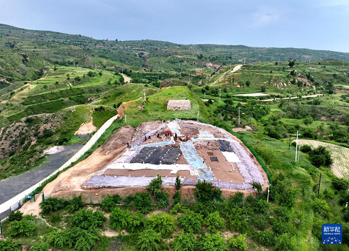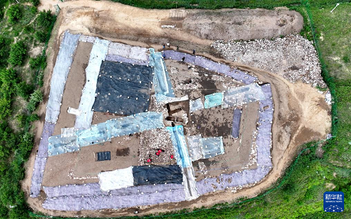 6月18日,宣化鄭家溝遺址考古發(fā)掘項(xiàng)目隊(duì)員在一號(hào)積石冢工作(無人機(jī)照片)。(新華社記者 王曉 攝)