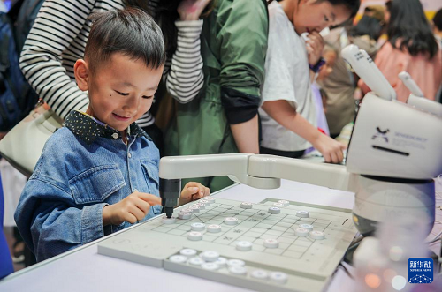 6月22日,小朋友在第9屆南博會(huì)上與機(jī)器人對(duì)弈。(新華社記者 高詠薇 攝)