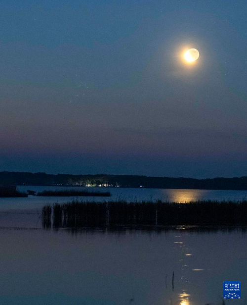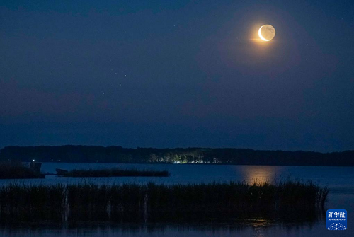 這是6月23日凌晨在黑龍江省齊齊哈爾市克欽湖拍攝的昴星團伴月。(新華社發(fā) 王勇剛 攝)