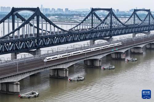 6月30日,一列動車組列車經(jīng)過武漢天興洲大橋延長線(無人機照片)。(新華社發(fā) 趙軍 攝)
