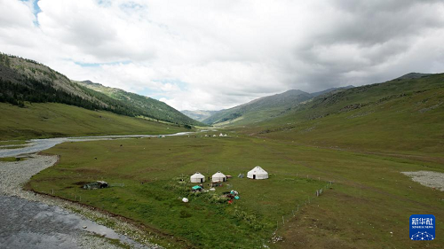 7月2日,在新疆阿勒泰市野卡峽,剛剛轉(zhuǎn)場(chǎng)而來的牧民們已搭建好氈房(無(wú)人機(jī)照片)。(新華社發(fā) 王友波 攝)