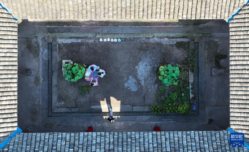 7月3日,游客在五泄鎮(zhèn)古民居內體驗漆扇制作(無人機照片)。(新華社記者 翁忻旸 攝)