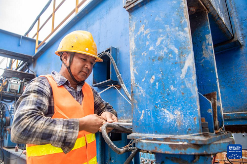 7月8日,工人在成渝中線高鐵土橋樞紐互通雙線特大橋建設(shè)現(xiàn)場(chǎng)施工作業(yè)。(新華社記者 唐奕 攝)