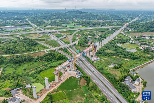 這是7月8日拍攝的成渝中線高鐵土橋樞紐互通雙線特大橋建設(shè)現(xiàn)場(chǎng)(無(wú)人機(jī)照片)。(新華社記者 唐奕 攝)