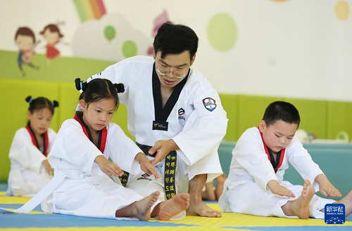 7月7日,在浙江省湖州市德清縣乾元鎮(zhèn)直街社區(qū)青少年宮,孩子在老師指導(dǎo)下學(xué)習(xí)跆拳道。(新華社發(fā) 倪立芳 攝)