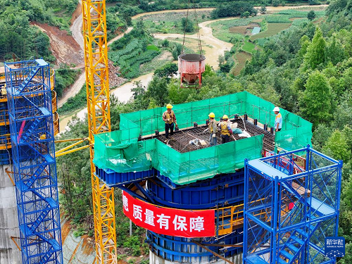 7月9日,工作人員對(duì)橋墩進(jìn)行最后的混凝土澆筑(無(wú)人機(jī)照片)。(新華社記者 劉續(xù) 攝)