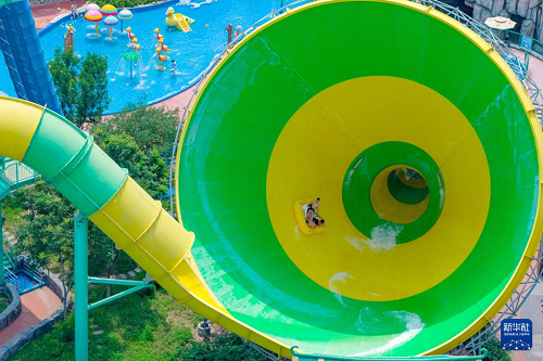 7月12日,游客在天津?yàn)I海新區(qū)方特水上樂園戲水納涼(無人機(jī)照片)。(新華社發(fā) 杜鵬輝 攝)