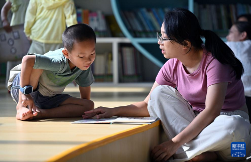 8月3日,家長(zhǎng)帶著孩子在位于??谑械暮D鲜D書館讀書。(新華社記者 郭程 攝)