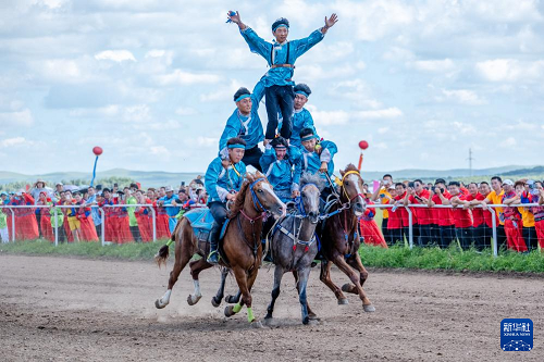 8月7日,演員在農(nóng)牧民那達(dá)慕大會(huì)上表演馬術(shù)。(新華社記者 馬金瑞 攝)
