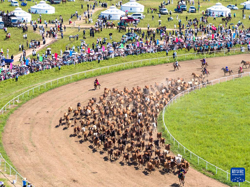 8月7日,游客在農(nóng)牧民那達(dá)慕大會(huì)上觀看跑馬表演(無(wú)人機(jī)照片)。(新華社記者 馬金瑞 攝)