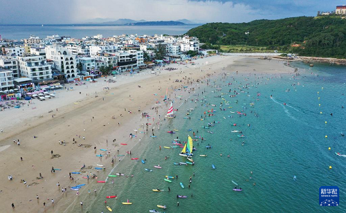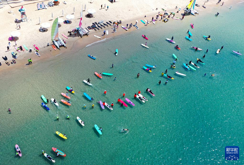 8月10日,游客在三亞市后海村附近海域沖浪嬉水(無(wú)人機(jī)照片)。(新華社記者 郭程 攝)