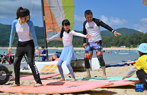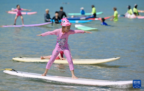 暑期,許多游客來(lái)到海南三亞,學(xué)習(xí)體驗(yàn)沖浪,感受與海共舞的樂(lè)趣。