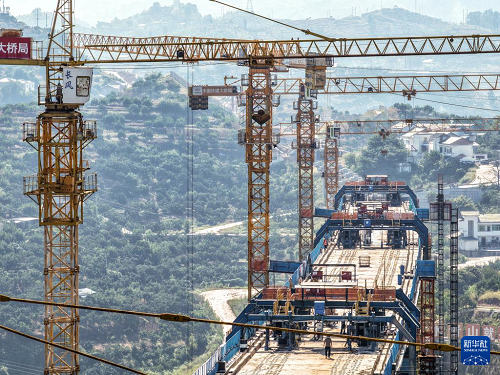 這是8月18日拍攝的渝萬高鐵渠溪河雙線特大橋施工現(xiàn)場(無人機(jī)照片)。(新華社記者 唐奕 攝)