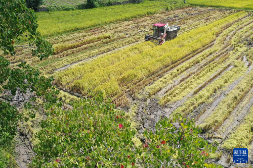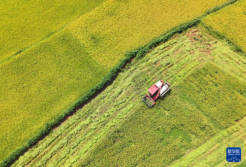 8月23日,農民駕駛收割機在湖南省湘西土家族苗族自治州龍山縣石羔街道收割水稻(無人機照片)。(新華社發(fā) 曾祥輝 攝)