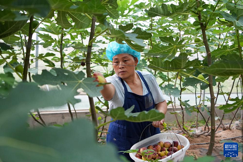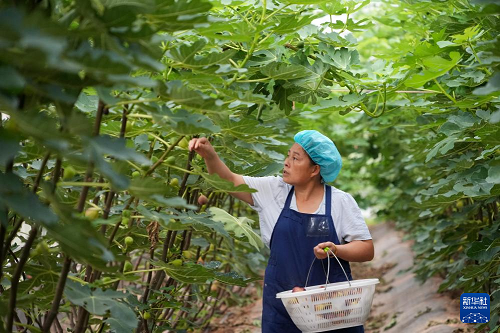 8月24日,在新泰市龍廷鎮(zhèn),果農(nóng)在采摘無花果。(新華社記者 徐速繪 攝)