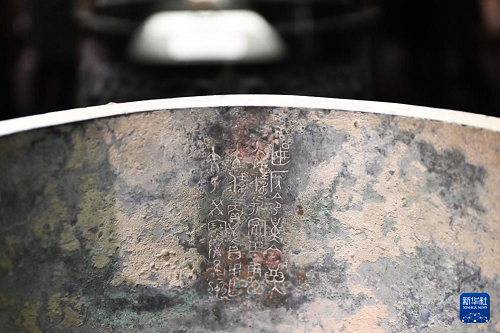 這是8月28日在展覽中拍攝的堇鼎內(nèi)壁的銘文。(新華社記者 陳鐘昊 攝)