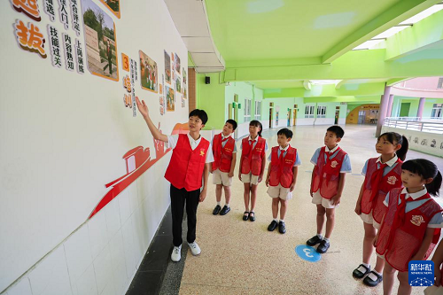 9月4日,北京師范大學南湖附屬學校的老師在給學生們講解“致敬禾城鐵血·同輝國旗榮光”——嘉興市新四軍老戰(zhàn)士抗戰(zhàn)英勇事跡圖版巡展的英雄事跡。(新華社記者 徐昱 攝)