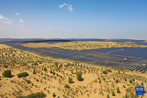 近年來,內(nèi)蒙古開展防沙治沙與風(fēng)電光伏一體化工程,推進(jìn)庫布其沙漠治理。目前,在鄂爾多斯市杭錦旗等庫布其沙漠北部地區(qū),一片片光伏基地在促進(jìn)新能源產(chǎn)業(yè)發(fā)展的同時(shí),成為當(dāng)?shù)厣鷳B(tài)治理、經(jīng)濟(jì)發(fā)展的堅(jiān)實(shí)屏障。“光伏+生態(tài)治理”建設(shè)模式實(shí)現(xiàn)板上發(fā)電,板間、板下統(tǒng)籌兼顧特色生態(tài)修復(fù)、經(jīng)濟(jì)作物、造林綠化與技術(shù)創(chuàng)新,打造立體生態(tài)修復(fù)模式,讓沙海變成綠色電能涌動(dòng)的“藍(lán)海”,實(shí)現(xiàn)生態(tài)效益與經(jīng)濟(jì)效益共贏。