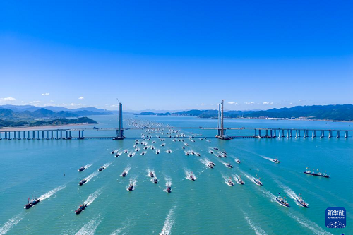 9月16日,漁船駛過(guò)浙江省寧波市象山港大橋開赴東海作業(yè)(無(wú)人機(jī)照片)。(新華社發(fā) 張輝 攝)