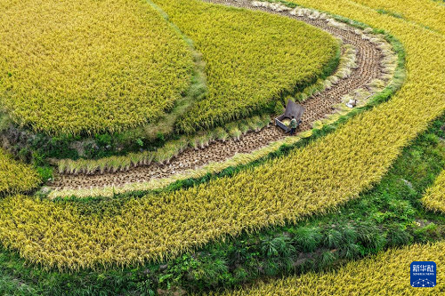 地處武陵山區(qū)腹地的重慶市黔江區(qū)五里鎮(zhèn)水稻種植面積5300畝,是武陵山地區(qū)糧食主要產(chǎn)區(qū)之一。秋收時(shí)節(jié),金黃色的水稻鋪滿山坡,稻農(nóng)們利用晴好天氣搶收稻谷,呈現(xiàn)出一派美麗的豐收畫(huà)卷。
