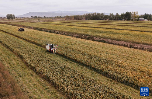秋分時節(jié),地處祁連山北麓、河西走廊中段的甘肅省張掖市各種作物陸續(xù)成熟,農(nóng)民開始收獲,田間一派豐收景象。