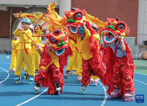 9月29日,在山東省榮成市實驗小學(xué),孩子們表演舞龍舞獅。(新華社發(fā) 李信君 攝)