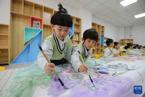 9月28日,甘肅省定西市安定區(qū)幼兒園的小朋友在繪制《我愛你中國》長卷。(新華社發(fā) 王克賢 攝)